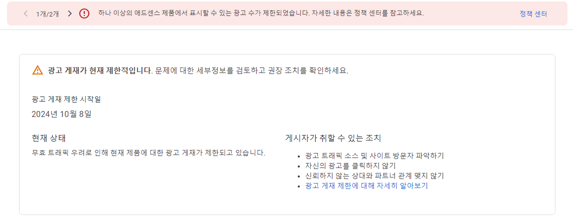 ※ 광고 게재 제한은 제한받은 개개인별로 제한 기간이 다른 듯 합니다. 개인적인 무효 트래픽에 대한 제한에서 해제일 까지인점 숙지바랍니다.