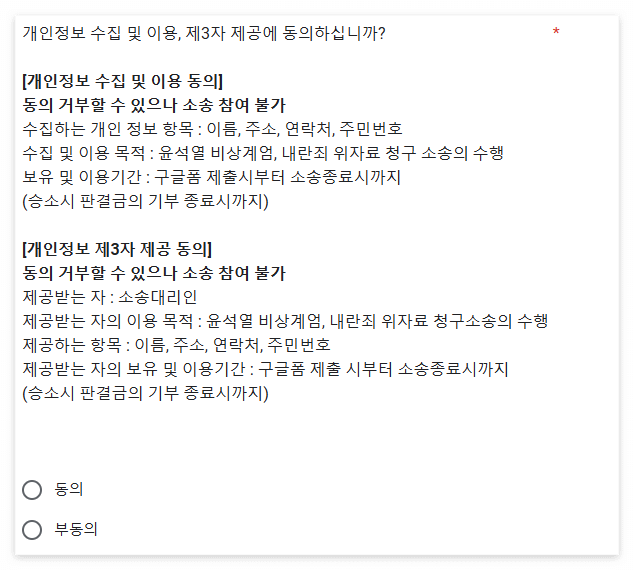 '윤석열 내란 행위에 대한 위자료 청구 소송 준비 모임'이 결성되었습니다. 이 모임은 윤석열 대통령을 상대로 1인당 10만 원의 위자료를 청구하는 소송을 준비하고 있습니다. 윤 대통령의 내란 행위로 인해 정신적 피해를 입었다고 주장하는 이들이 모여 시작된 것입니다. 윤석열 대통령의 행위가 국민에게 미친 영향은 매우 심각하며, 많은 사람들이 그의 결정으로 인해 정신적 고통을 겪었다고 느끼고 있습니다. 이러한 고통을 법적으로 인정받기 위해서는 소송이 필요합니다. 이 소송은 단순한 금전적 보상을 넘어서, 정치적 책임을 묻는 중요한 의미를 지니고 있습니다. 소송에 참여하고자 하는 분들은 간단한 절차를 통해 등록할 수 있습니다. 변호사 선임료는 무료이며, 승소금액은 전액 기부되는 조건입니다. 동참하실 분들은 아래 링크를 통해 참여하실 수 있으니 참조하시기 바랍니다.