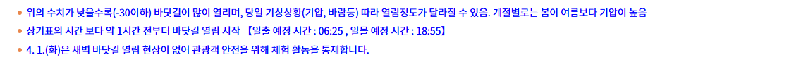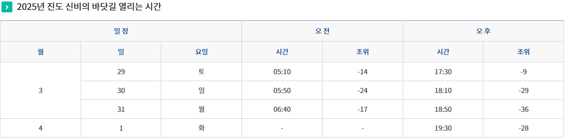 진도 신비의 바닷길은 고군면 회동리와 의신면 모도리 사이 약 2킬로미터 바다가 조수간만의 차이로 음력 2월 그믐날 수심이 낮아질 때 진도 ~ 모도 바닷길이 드러나는 현상으로 30 ~ 40m의 폭으로 활짝 펼쳐지는데 그 신비로움이 예사롭지 않다고 합니다. 매년 축제기간 이 현상을 모기 위해 수많은 관광객들이 진도를 방문해 바닷길이 완전히 드러나 있는 약 1시간 동안 기적의 순간을 만끽합니다. 진도군에서는 신비의 바닷길 축제기간 동안 찬한한 진도의 무형문화유산 진도아리랑, 강강술래등을 선보이고 다양한 이벤트로 풍성한 볼거리, 즐길거리를 제공해 관광객들의 흥을 북돋웁니다.