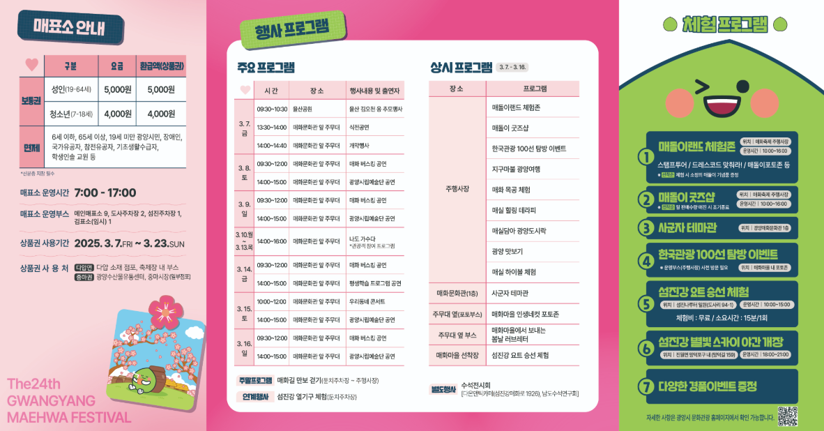 광양 매화축제는 매년 많은 관광객과 시민들이 참여하는 중요한 봄 축제입니다. 이 축제는 전라남도 광양시 다압면에 위치한 매화마을에서 열리며, 매년 3월 초에 진행됩니다. 특히 이번 2025년 축제는 3월 7일(금)부터 3월 16일(일)까지 10일간 열립니다. 이 시기가 되면 매화가 한껏 만개하여 아름다운 경관을 만들어냅니다.