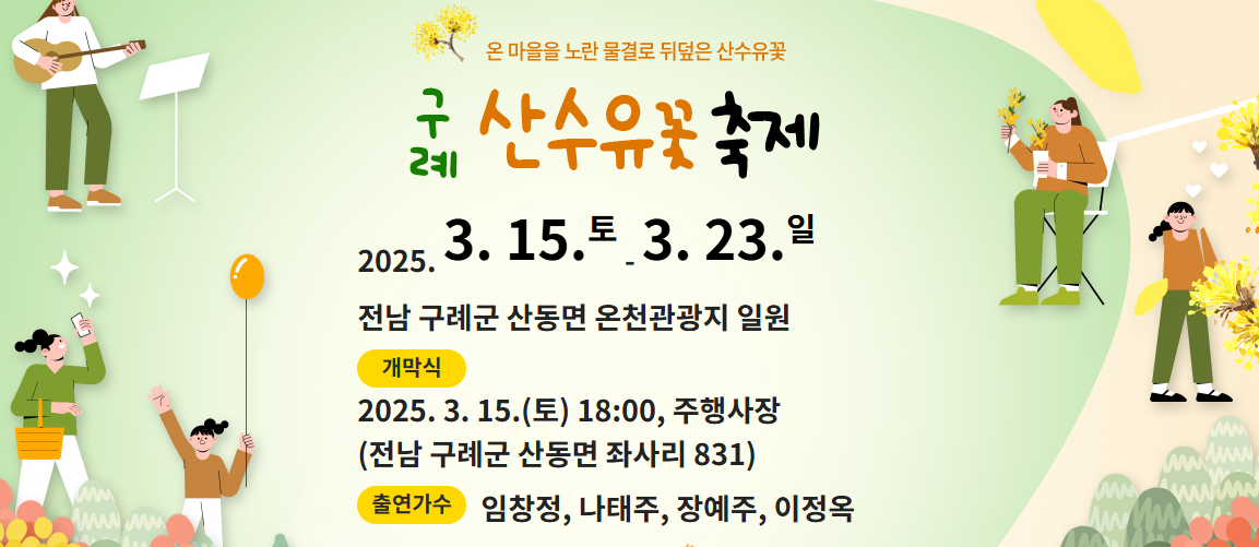 구례 산수유 축제는 매년 봄에 열리는 대표적인 꽃 축제로, 2025년에는 3월 15일부터 3월 23일까지 진행됩니다. 이 축제는 전라남도 구례군에서 열리며, 산수유 꽃이 만개하는 시기에 맞춰 많은 관광객들이 방문합니다. 축제 장소는 전라남도 구례군 산동면 상관1길 45에 위치한 구례 산수유꽃축제장입니다. 축제의 개막식은 3월 15일 오후 6시에 열리며, 다양한 공연과 이벤트가 준비되어 있습니다. 출연가수로는 임창정, 나태주, 장예주, 이정옥이 출연하여 축제 행사를 빛내 주리라 생각이 됩니다. 주요 행사로는 산수유열매 까기 대회, 산수유꽃길 걷기, 어린이 활쏘기 및 놀이 체험등 많은 놀거리 즐길거리가 준비된 만큼 나들이 계획을 준비하시는 것도 좋을 것이라 생각됩니다.
