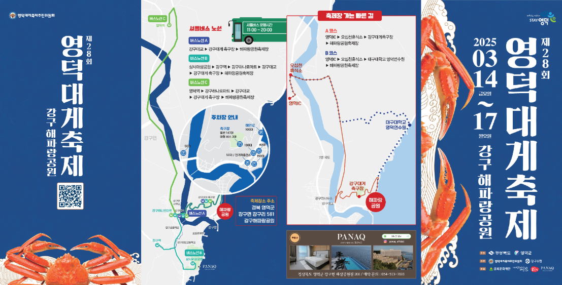 영덕 대게축제는 3월 14일(금)부터 3월 17일(월)까지 총 4일간 강구 해파랑 공원에서 개최됩니다. 이곳은 아름다운 바다 경관과 함께 축제를 즐기시기 바랍니다.