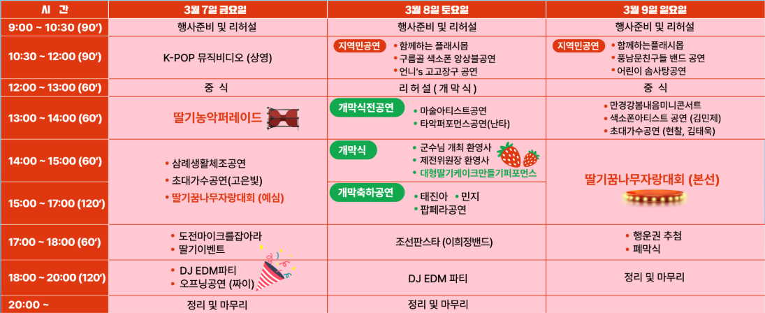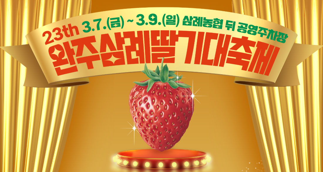 2025년 완주 삼례 딸기대축제는 3월 7일(금)부터 3월 9일(일)까지 3일간 진행됩니다. 축제 장소는 삼례농협 인근 공영주차장으로, 접근성이 뛰어나 많은 사람들이 쉽게 방문할 수 있습니다. 행사기간동안 다양한 프로그램이 진행됩니다.